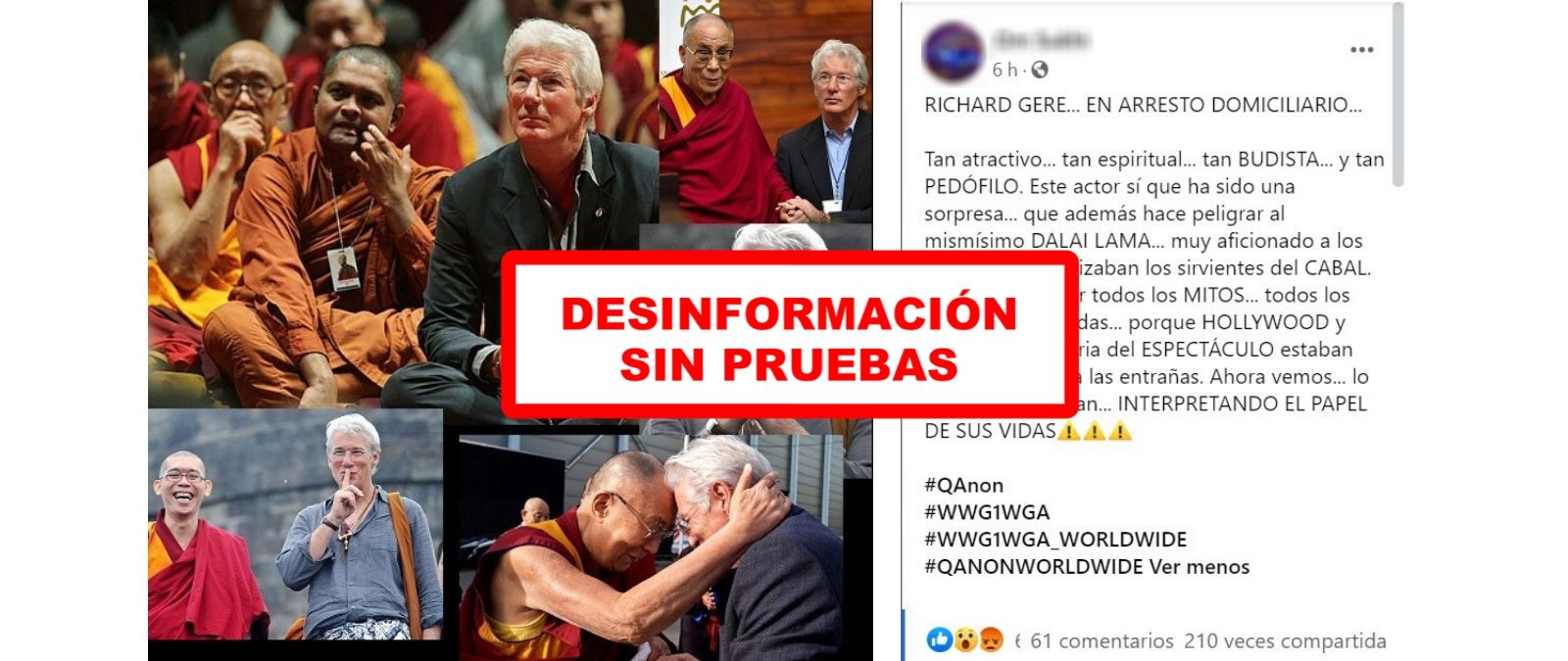 Se está difundiendo un contenido que afirma que Richard Gere se encuentra en arresto domiciliario por ser un "pedófilo". Sin embargo, no hemos encontrado ninguna prueba de que el actor estadounidense se encuentre en esa situación o haya sido detenido. El texto se comparte con referencias a "QAnon", un grupo de personas que cree en la existencia de una red de pedofilia en la que estarían involucrados políticos y actores de Hollywood. Os lo contamos.