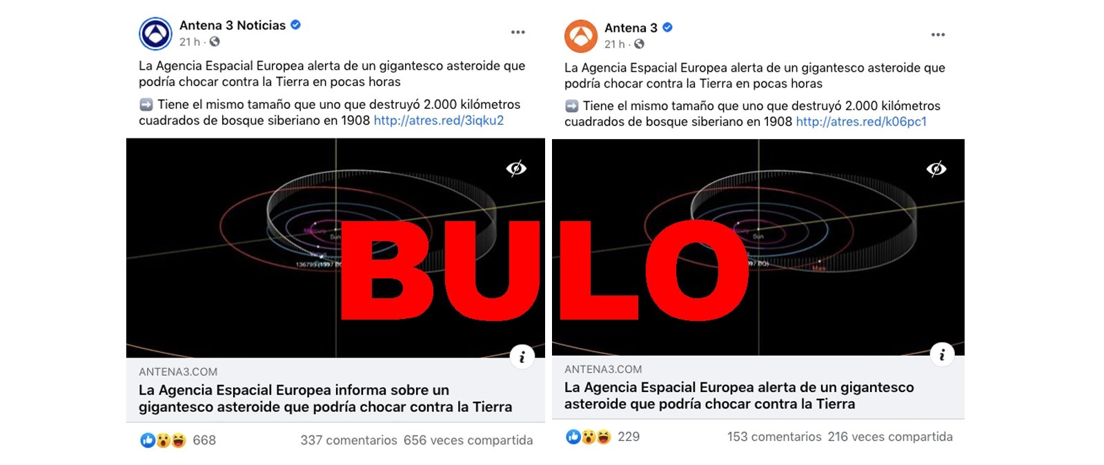 Aunque Antena 3 ha incluido una fe de erratas en su artículo y ha borrado el tuit en el que lo difundía, al cierre de esta información siguen manteniendo dos publicaciones en Facebook en las que señalan que la ESA habría alertado de un "gigantesco asteroide que podría chocar contra la Tierra en pocas horas" (puedes ver una versión archivada aquí y aquí). Como decimos, dicha agencia espacial no ha hecho esa alerta.