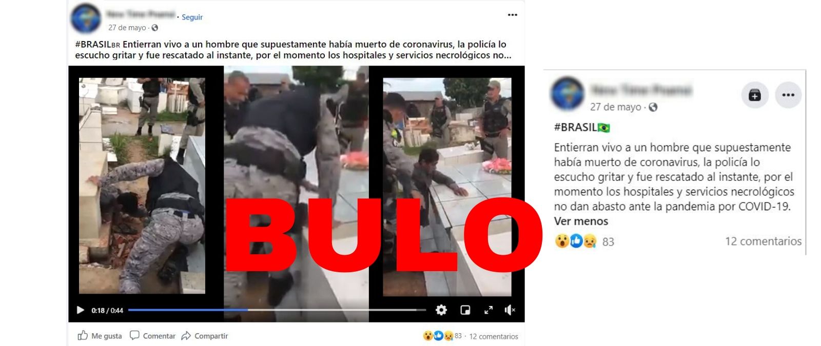 Está circulando un vídeo en redes sociales en el que se puede ver cómo dos policías sacan a una persona del interior de una tumba. El mensaje con el que se comparten las imágenes asegura que se trata de un hombre que supuestamente había muerto con coronavirus en Brasil y al que habrían enterrado vivo. Es un bulo. El vídeo circula desde enero de 2019, antes de la pandemia de coronavirus, y la persona a la que rescatan es un joven que se encontraba en la tumba de su padre.