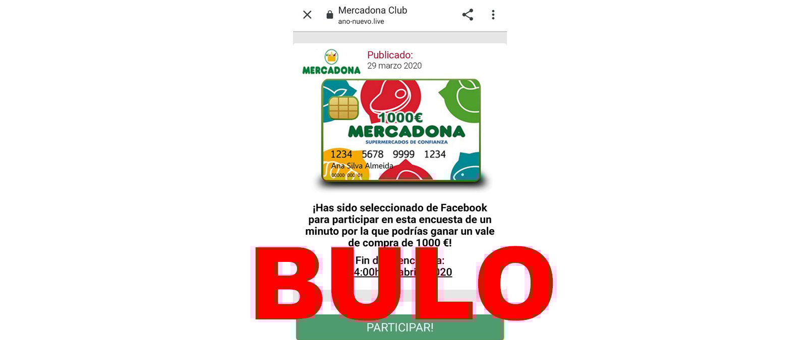 Nos habéis consultado por una web que te ofrece la posibilidad de ganar un vale de compra de 1.000€ de Mercadona si participas en una encuesta. Es un bulo, se trata de phishing, una técnica que utilizan estafadores para quedarse con tus datos personales.