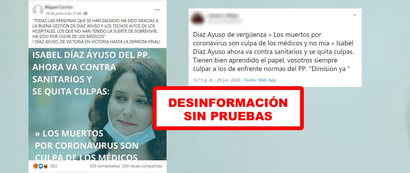 Se está compartiendo mucho en redes sociales una frase que se atribuye a la presidenta de la Comunidad de Madrid, Isabel Díaz Ayuso, quien supuestamente habría dicho que "los muertos por coronavirus son culpa de los médicos y no mía". Pero no hay ninguna prueba de que sean unas declaraciones de Ayuso.