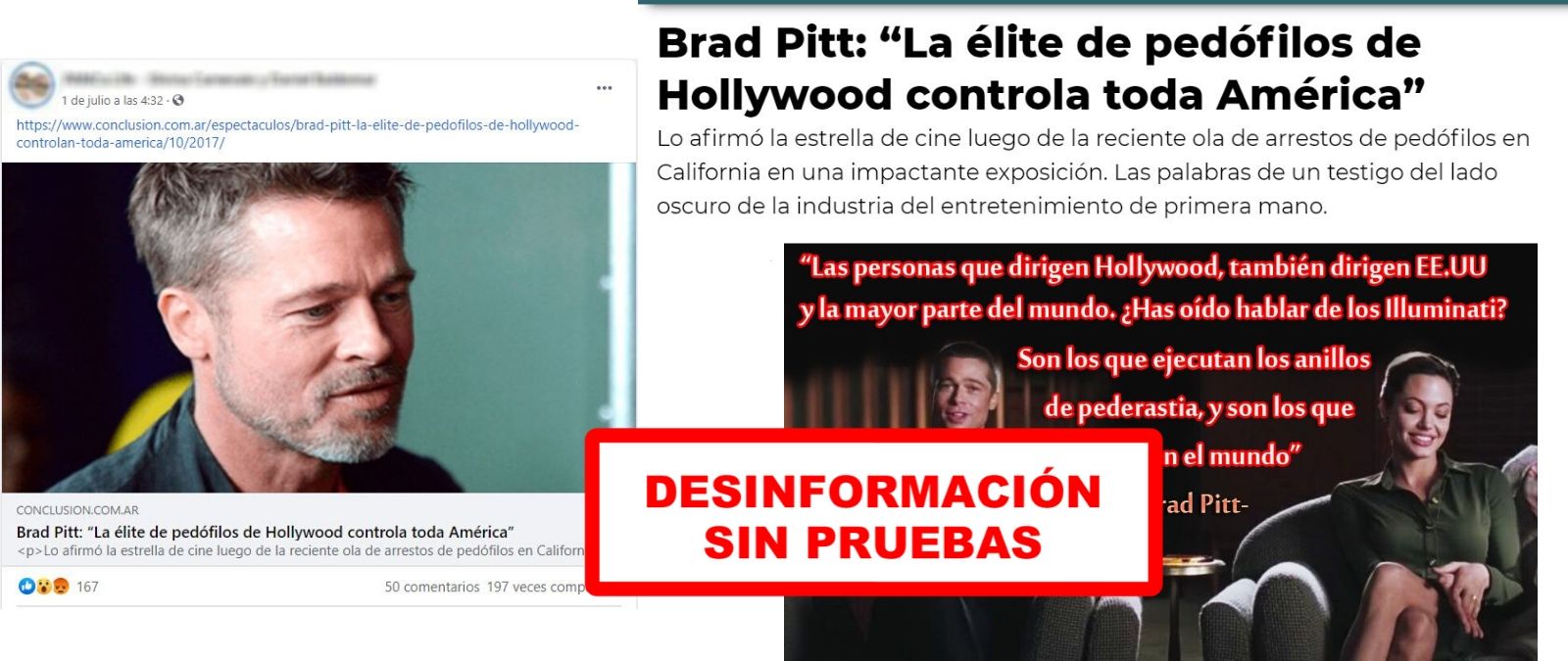 Está circulando un contenido que asegura que el actor Brad Pitt ha dicho que "la élite de pedófilos de Hollywood controla toda América", una frase que habría pronunciado después de una supuesta oleada "de arrestos de pedófilos en California". Pero no hay pruebas de que Brad Pitt haya hecho esa afirmación y el contenido se está volviendo a compartir ahora aunque el texto se publicó en 2017.