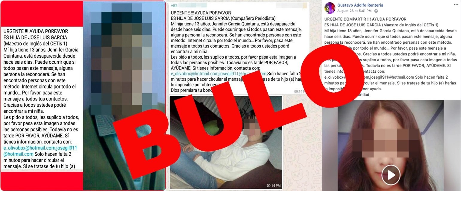 Jennifer García tiene varias caras, vive en Mexico, Venezuela, Argentina, Panamá y España y de su padre se dice que es trabajador de diferentes compañías. Así es la historia de un bulo que lleva difundiéndose 8 años y que ha saltado de un punto a otro del globo terráqueo sin muchas modificaciones. Ahora nos lo seguís preguntado a través de nuestro chatbot de WhatsApp (644 22 93 19), donde nos habéis hecho llegar dos mensajes sobre esta supuesta desaparición con fotos de dos niñas distintas afirmando por un lado que su padre es "compañero periodista" y por otro, que es "Maestro de Inglés del CETis 1" . Os explicamos lo que sabemos.
