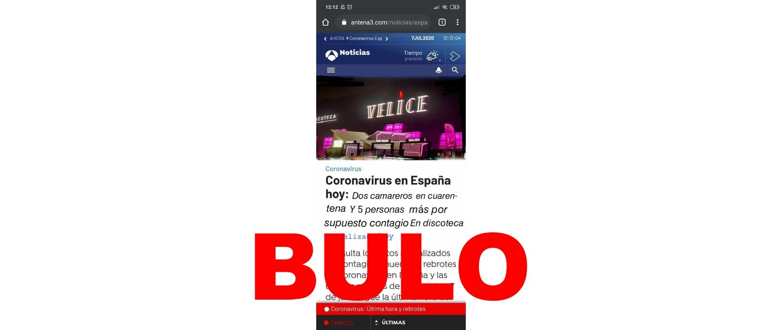 Nos habéis consultado por una supuesta imagen de la web de Antena 3 en la que pone "Coronavirus en España hoy: Dos camareros en cuarentena y 5 personas más por supuesto contagio en discoteca" e incluye una imagen de Velice Discoteca, en Torrevieja (Alicante). Es un bulo, la imagen es un montaje. Además, la Conselleria de Sanitat Universal i Salut Pública de la Generalitat Valenciana no tiene constancia de este supuesto contagio, a fecha del 08/07/2020 a las 17:40.