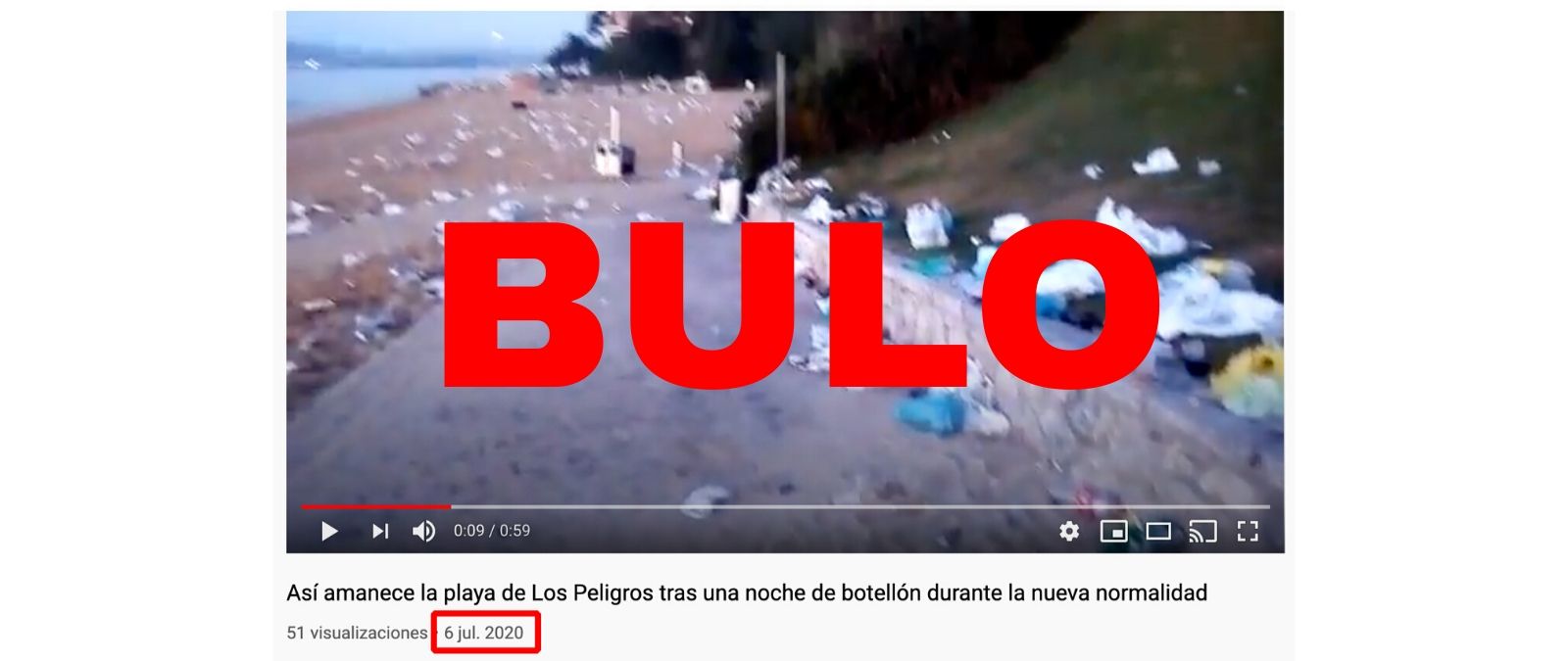 En el vídeo se escucha cómo un hombre dice que se encuentra en "la república bananera de Santander" y que esa es la playa de Los Peligros. El vídeo se compartió el 5 de julio en un grupo de Facebook con el comentario "INSANIDAD. Se repite en cualquier parte... Mas guarros y reguarros y no nacemos" (sic). El mismo día se publicó este vídeo en YouTube diciendo que hay mascarillas tiradas en la playa. Un día más tarde también se publicó en en la misma plataforma con el título "Así amanece la playa de Los Peligros tras una noche de botellón durante la nueva normalidad".