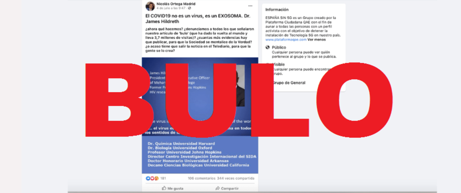 Nos habéis hecho llegar un contenido compartido en redes sociales que defiende que el coronavirus que causa la COVID-19 “no es un virus, es un exosoma”, y donde se atribuye esta afirmación a James E. K. Hildreth, un médico estadounidense experto de VIH, y presidente del Meharry Medical College, una universidad situada en Nashville, Tennessee. Es un bulo. La afirmación viene de un artículo del año 2003, se refería al VIH y no al SARS-CoV-2 y está descontextualizada. De hecho Hildreth ha denunciado que se utilice su trabajo para asegurar que el SARS-CoV-2 no existe. Os explicamos.