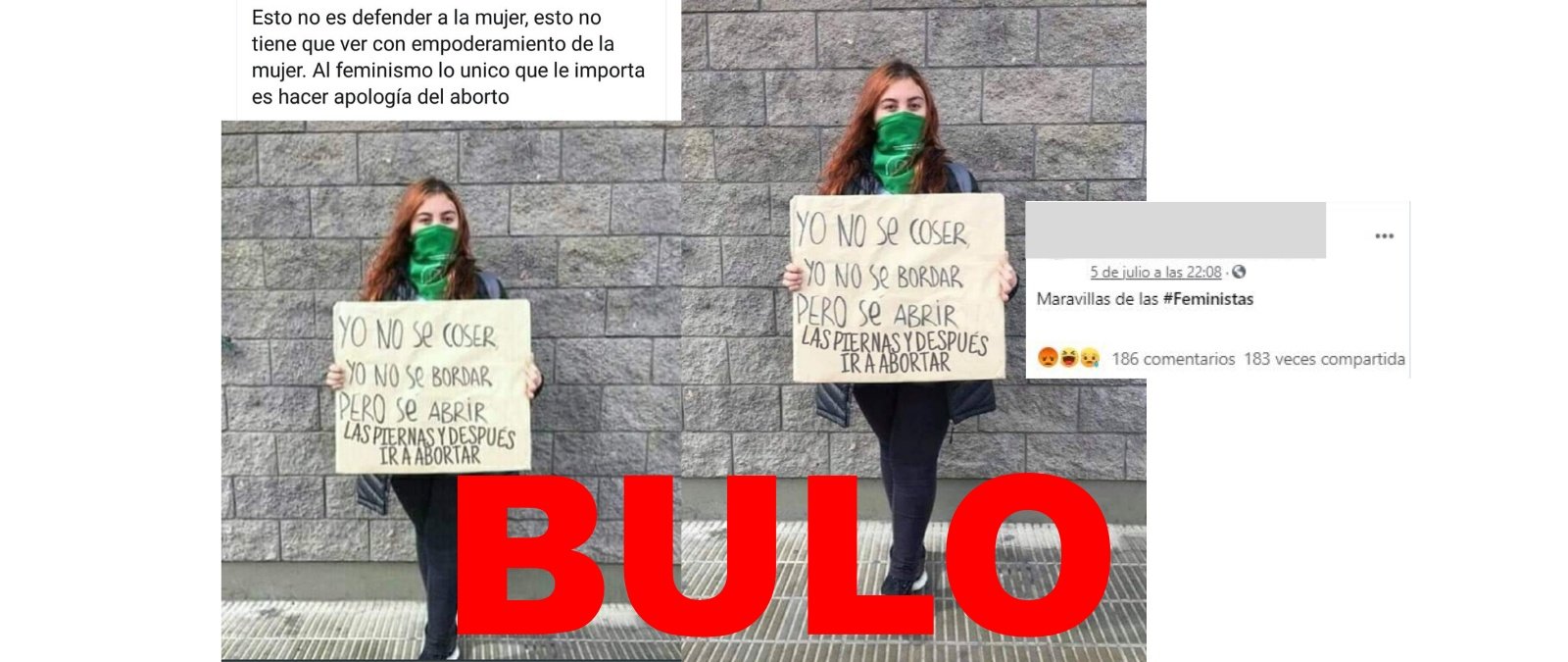 Se ha viralizado una imagen en la que una mujer sostiene un cartel en el que pone "yo no sé coser, yo no sé bordar, pero sé abrir las piernas y después ir a abortar" y se comparte con mensajes que señalan a las feministas. Es un bulo, se trata de un montaje.
