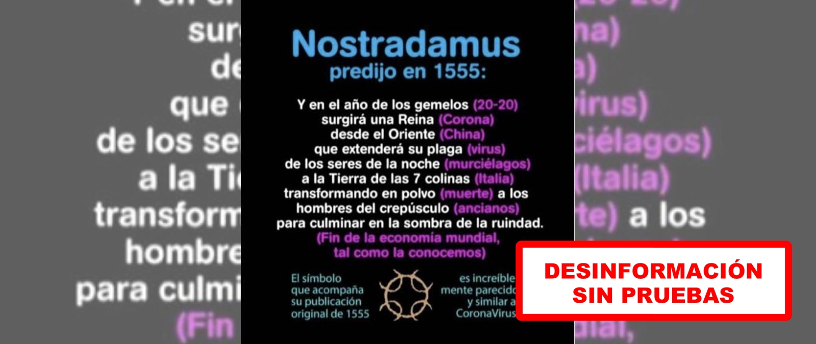 Nostradamus y el coronavirus. Más allá de la no evidencia científica de eso que llaman “predicciones”, ha vuelto a circular por redes sociales una imagen que dice que Nostradamus “predijo” en 1555 el coronavirus. En esta imagen se asegura que Nostradamus escribió un texto que decía: "En el año de los gemelos surgirá una reina desde el Oriente que extenderá su plaga de los seres de la noche a la Tierra de las 7 colinas transformando en polvo a los hombres del crepúsculo para culminar en la sombra de la ruindad". No hay pruebas de que Nostradamus escribiera este texto.*