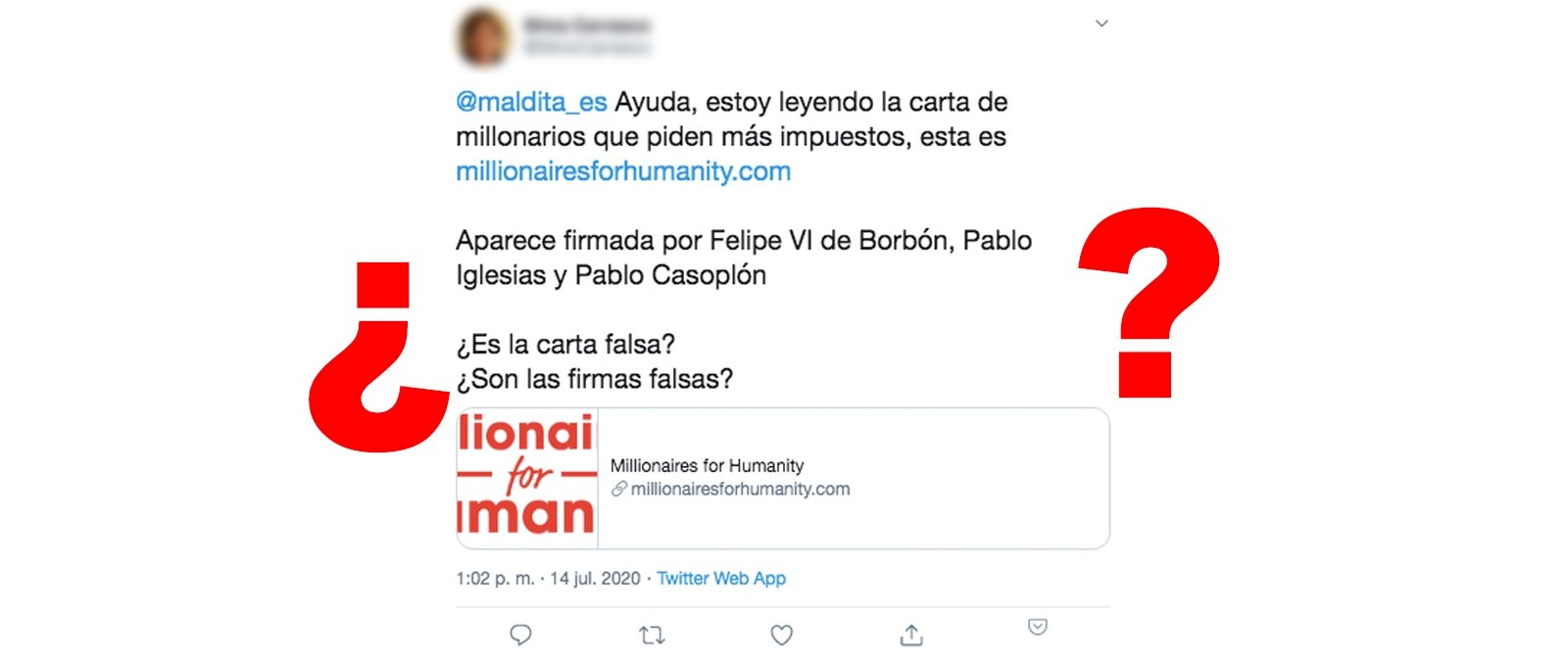 Nos habéis preguntado por la carta en la que 83 millonarios de todo el mundo han pedido pagar más impuestos para luchar contra la pandemia, entre ellos, la heredera de Disney. La carta es real, pero el 14 de julio se apuntaron firmantes falsos a la lista, que ya está siendo verificada, según nos indican desde Patriotic Millionaires y Oxfam, entidades organizadoras del proyecto.