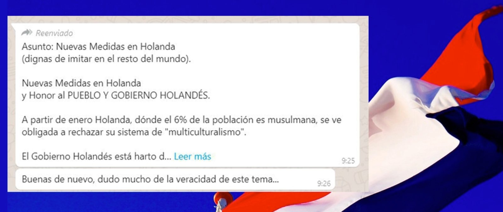 Nos habéis preguntado mucho por un mensaje viral que anuncia "nuevas medidas en Holanda". En este mensaje, que lleva varios años circulando, se afirma que "a partir de enero" el país va a rechazar su sistema de multiculturalismo y habla de “un nuevo proyecto presentado al Parlamento holandés" con el que “el Gobierno va a prohibir el uso de vestimentas que cubran todo el rostro como el velo, el burka y la hijab” y que “dejará de otorgar subsidios especiales a los musulmanes en favor de la integración”. Os contamos lo que sabemos: