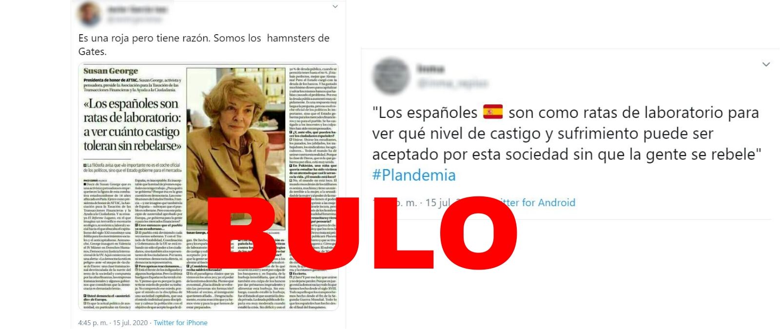 Estos días están circulando unas declaraciones de la politóloga y activista estadounidense Susan George en las que dice que "los españoles son ratas de laboratorio: a ver cuánto castigo toleran sin rebelarse". La frase se comparte relacionada con la pandemia actual de coronavirus. Es cierto que George hizo esas declaraciones pero es un bulo que las haya hecho en relación a la crisis del coronavirus, pues salen de una entrevista realizada en 2012.