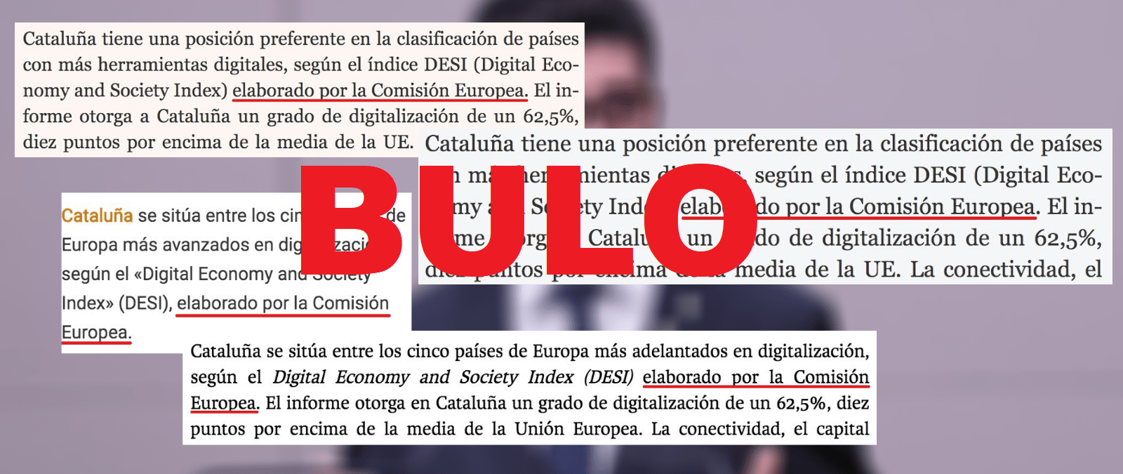 El dato del que habla Puigneró y se hacen eco las desinformaciones, que supuestamente posicionaría a Cataluña en quinta posición, no sale del índice DESI de la Comisión Europea, sino de un informe que ha sido elaborado por la consejería de Políticas Digitales y Administración Pública de la Generalitat de Cataluña en colaboración con el Círculo Tecnológico de Cataluña (CTecno) y el Orkestra-Instituto Vasco de Competitividad.