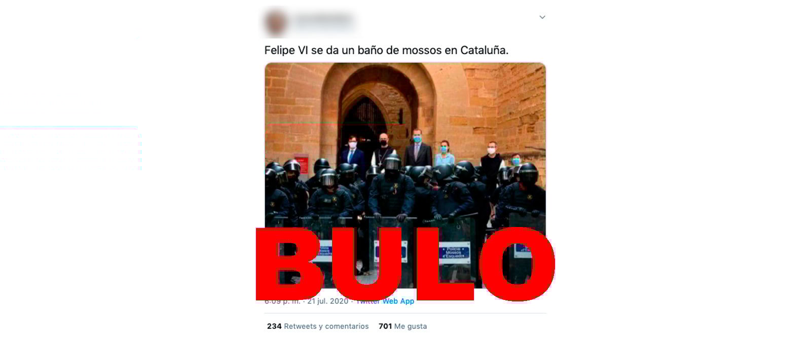 Nos estáis preguntando por una imagen de los reyes posando detrás de unos agentes de antidisturbios de los Mossos d'Esquadra que se ha viralizado como si fuera real. Es un bulo: la autora ha reconocido que se trata de un montaje y en la foto original, tomada durante la visita de los reyes a Poblet (Tarragona), no aparecen los policías.