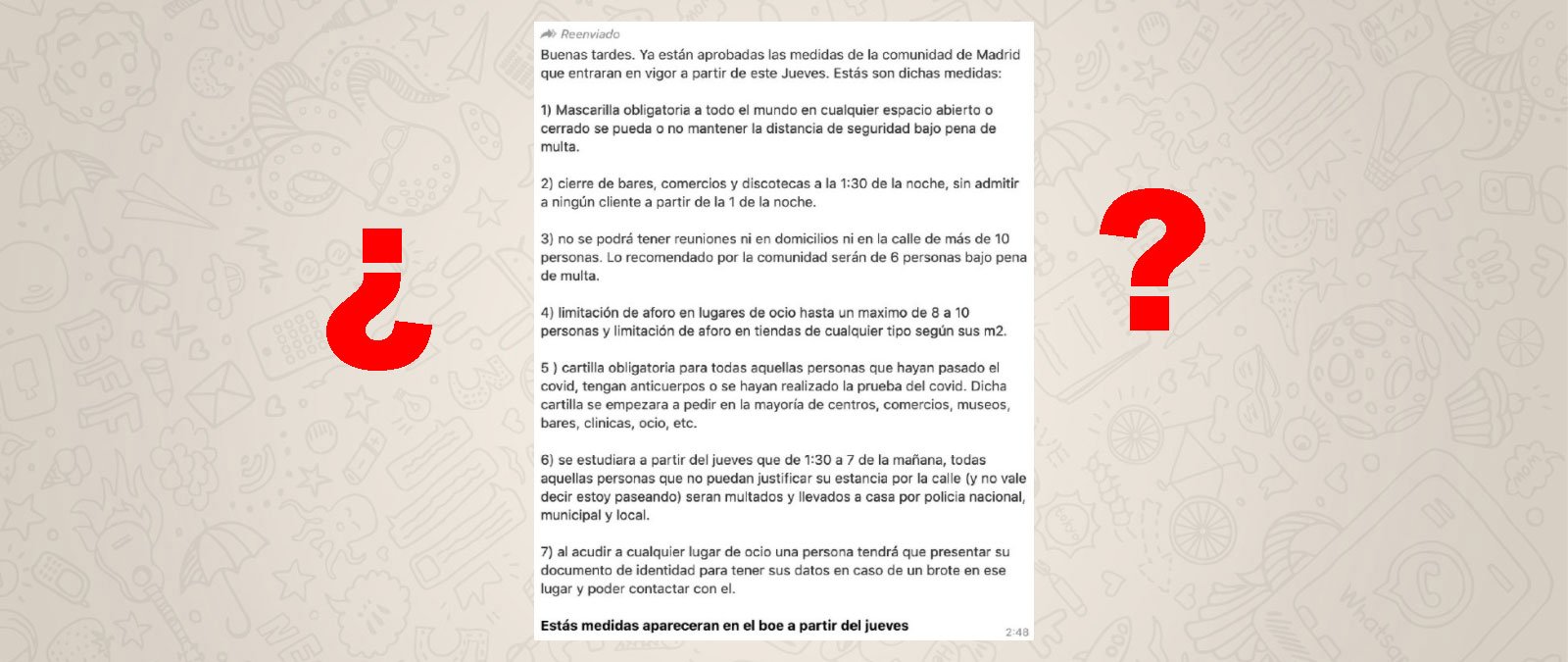 En las últimas horas no habéis parado de preguntarnos por una cadena de WhatsApp en la que se recogen las supuestas medidas adoptadas por la Comunidad de Madrid ante la COVID-19. Aunque algunas como el uso obligatorio de la mascarilla o el cierre de los establecimientos a la 1:30 de la madrugada son reales, hay otras que no aparecen en la publicación del Boletín Oficial de la Comunidad de Madrid (BOCM), a fecha de 29 de julio de 2020.