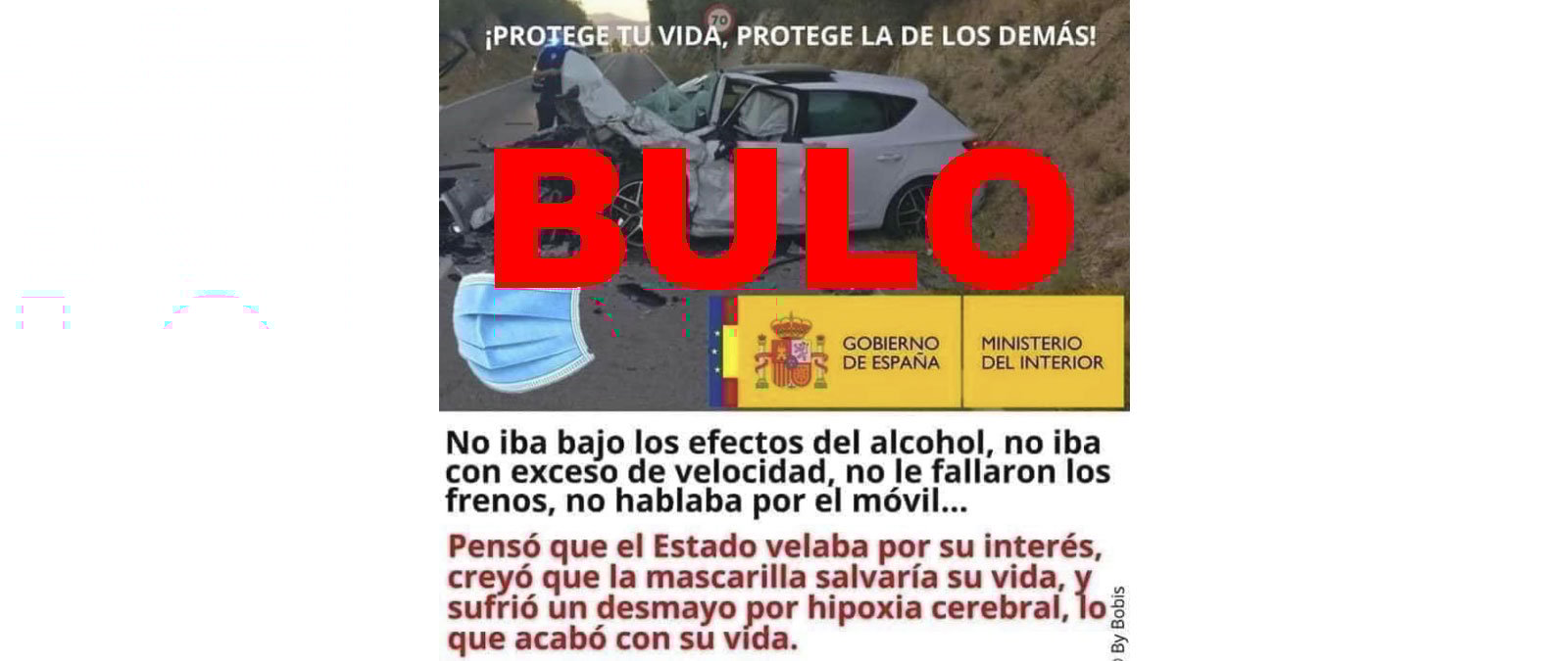 Circula por redes una imagen de un accidente de tráfico cuyo conductor murió supuestamente al sufrir una hipoxia por llevar puesta la mascarilla. Sin embargo, se trata de un bulo puesto que la foto corresponde a un accidente de tráfico ocurrido en Mallorca el 1 de junio de 2019, meses antes de la pandemia de la COVID-19 y de que el Gobierno recomendara el uso de las mascarillas.