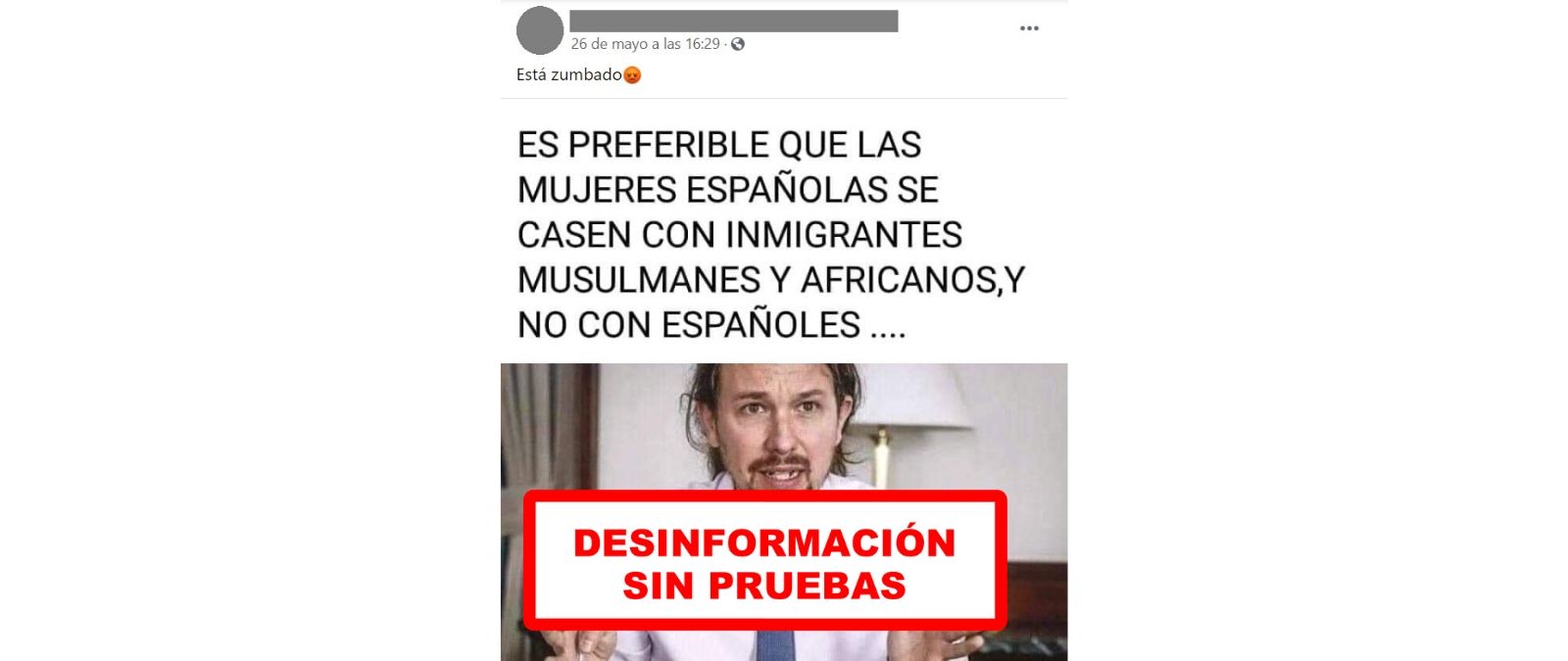 Se está moviendo en redes sociales una imagen en forma de meme del vicepresidente segundo del Gobierno, Pablo Iglesias, con la frase "es preferible que las mujeres españolas se casen con inmigrantes musulmanes y africanos, y no con españoles". Se está viralizando como si fuese una frase real pronunciada por Pablo Iglesias pero no hay ninguna declaración, tuit o entrevista que recoja estas supuestas afirmaciones del líder de Unidas Podemos.