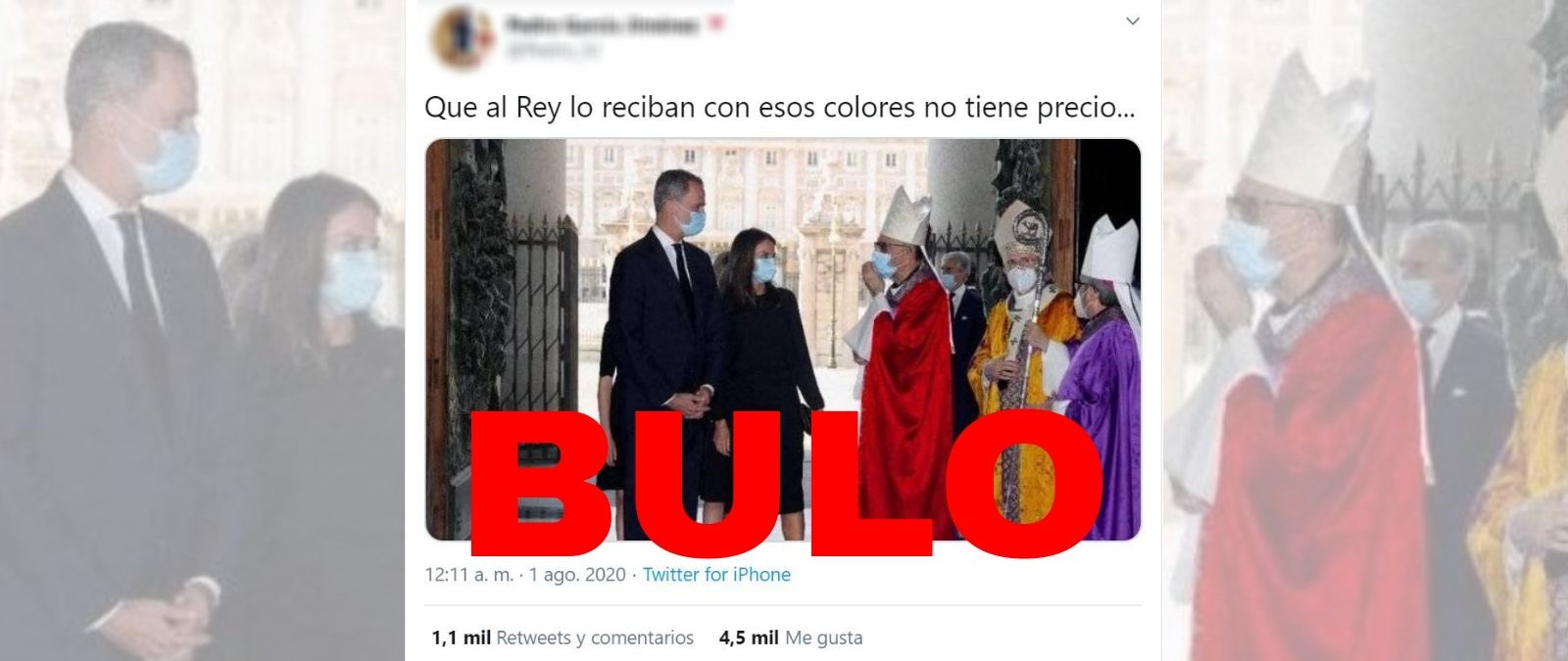Esta imagen la compartió un usuario de Twitter el 1 de agosto que decía "que al Rey lo reciban con esos colores no tiene precio...". Sin embargo, la foto original fue tomada el 6 de julio a la llegada de los reyes a la misa funeral celebrada por los fallecidos por la pandemia de coronavirus. El autor de la fotografía es Juanjo Martín y se publicó originalmente en la Agencia EFE.