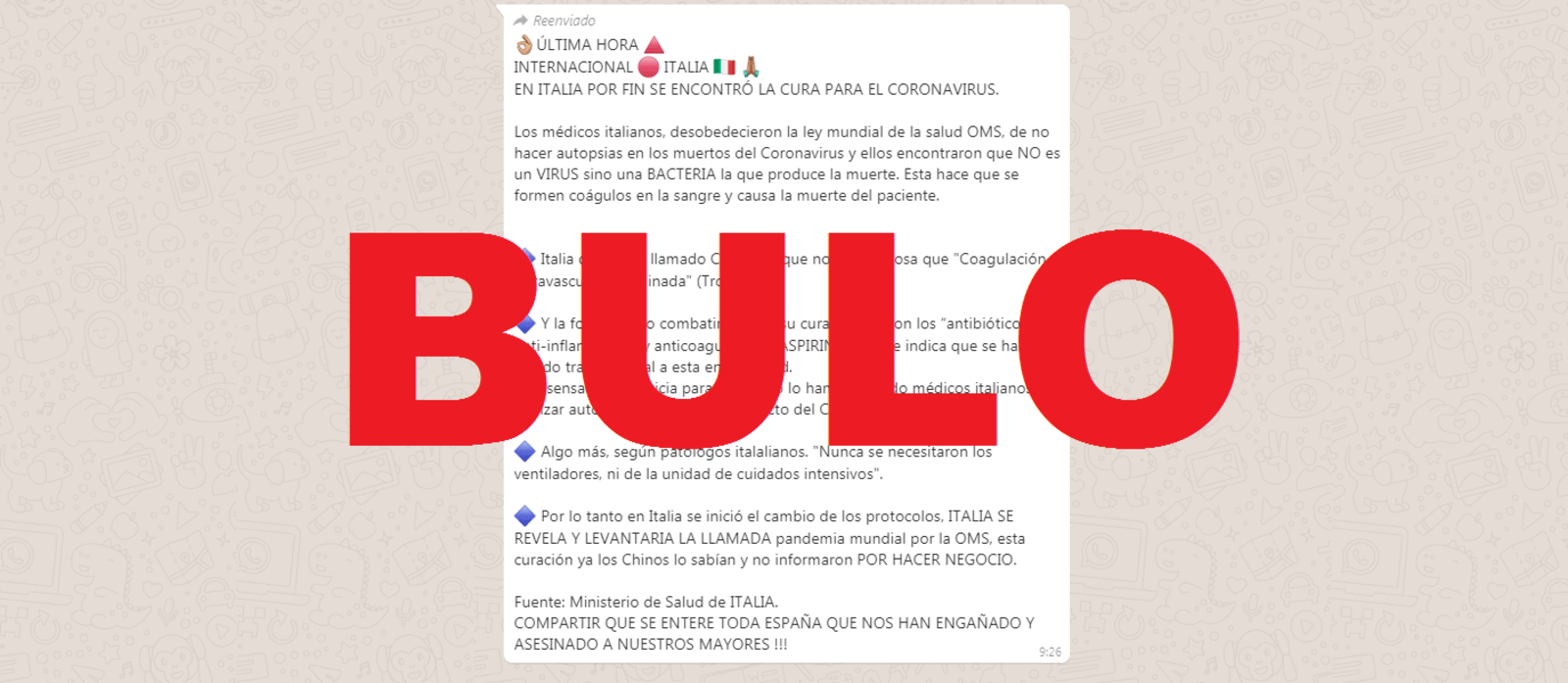 No para de viralizarse una cadena de WhatsApp que dice que en Italia ya se ha encontrado la cura para el coronavirus, gracias a que los médicos italianos desobedecieron "la ley mundial de la salud OMS" de no realizar autopsias a los fallecidos por coronavirus. Esta sería la manera en la que habrían hallado que la causa de la COVID-19 "no es un virus" sino "una bacteria que produce la muerte" haciendo que "se formen coágulos en la sangre". Esto es un bulo. Te contamos lo que sabemos al respecto.