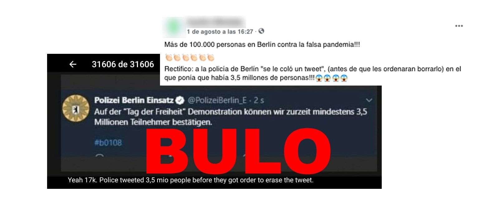 Por lo tanto, no es cierto que la Policía de Berlín confirmara que asistieron 3,5 millones de participantes a la manifestación del "Día de la Libertad" desde su cuenta @PolizeiBerlin_E. Además, ya hemos desmentidos los casos de fotografías que se están viralizando como si fueran de esta manifestación del pasado 1 de agosto y que en realidad son antiguas (aquí, aquí y aquí).