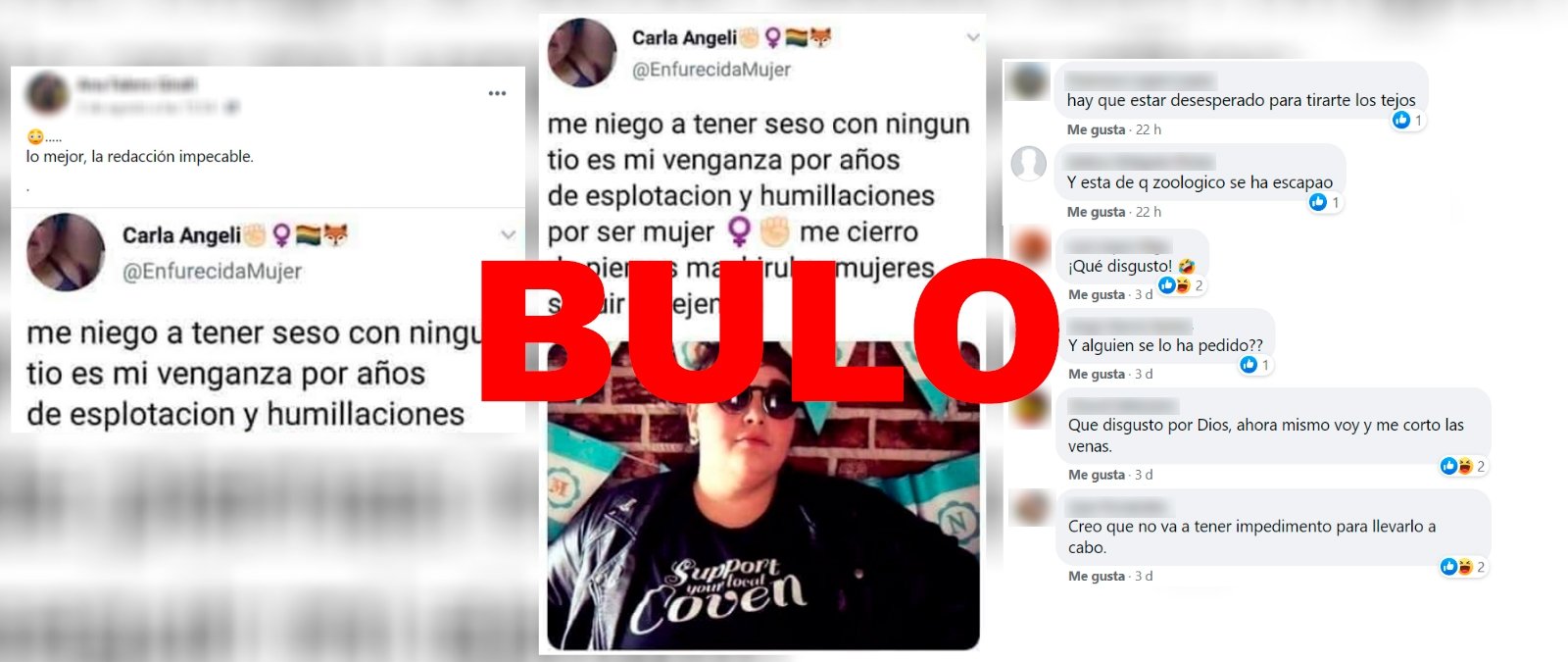 "Me niego a tener seso con ningun tio es mi venganza por años de esplotacion y humillaciones por ser mujer [sic]". La cuenta de Twitter (ahora X) EnfurecidaMujer publicó este mensaje que se viralizó como si se tratase de la publicación de una feminista real. Sin embargo, en su perfil se define como “parodia” y “fake", y el tuit cuya captura se difunde ha sido eliminado.