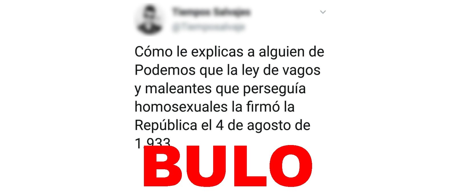 Está volviendo a circular una publicación que asegura que la ley de vagos y maleantes aprobada en agosto de 1933 durante la Segunda República incluía a las personas homosexuales. Es un bulo: los homosexuales fueron incluidos en dicha ley en julio de 1954, ya durante el franquismo.
