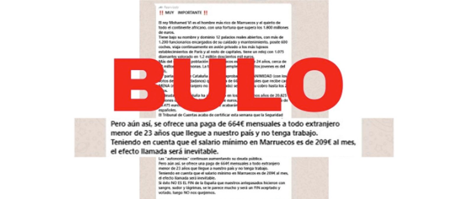 Nos ha llegado una cadena de Whastapp que empieza hablando del rey Mohamed VI como "el hombre más rico de Marruecos y el quinto de todo el continente africano...". Después, pasa por la deuda de Cataluña y cierra con el salario mínimo en Marruecos. A medio camino asegura que "se ofrece una paga de 664€ mensuales a todo extranjero menor de 23 años que llegue a nuestro país y no tenga trabajo".