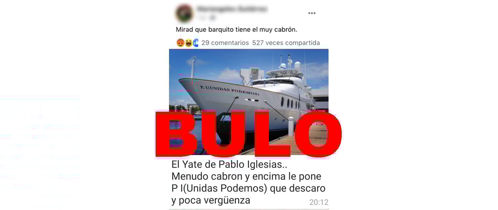 Además de que en la foto original no aparecen las iniciales de Iglesias ni a su partido, hemos comprobado que en su última declaración de bienes, registrada en el Congreso de los Diputados en noviembre de 2019, no figura ningún yate.