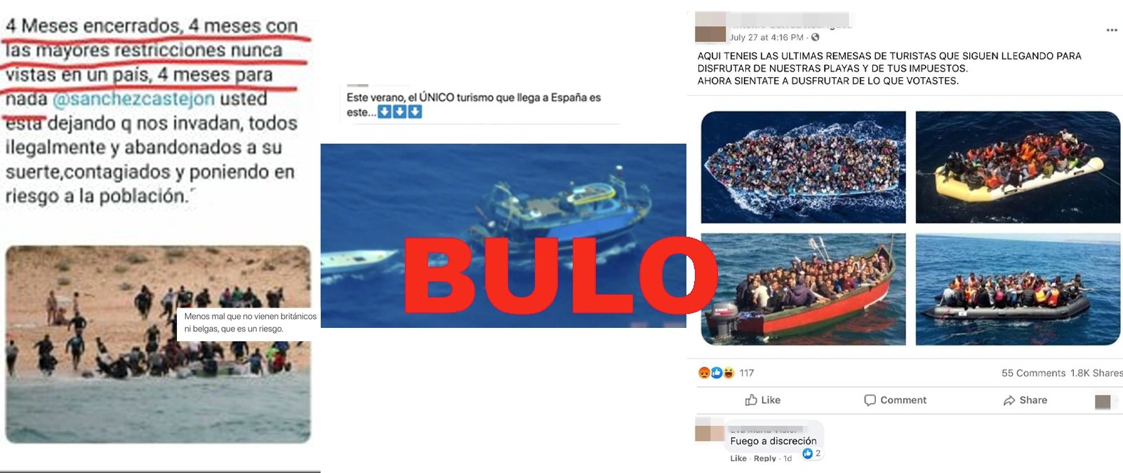 "Últimas remesas de turistas que siguen llegando para disfrutar de nuestras playas y de tus impuestos", afirma un mensaje con el que se difunden como actuales cuatro fotos de personas inmigrantes en pateras. También se está compartiendo como reciente una foto de personas desembarcando en una playa con mensajes como “4 meses encerrados, 4 meses con las mayores restricciones nunca vistas en un país, 4 meses para nada @SanchezCastejon, usted está dejando que nos invadan, todos ilegalmente y abandonando a su suerte, contagiados y poniendo en riesgo a la población”.