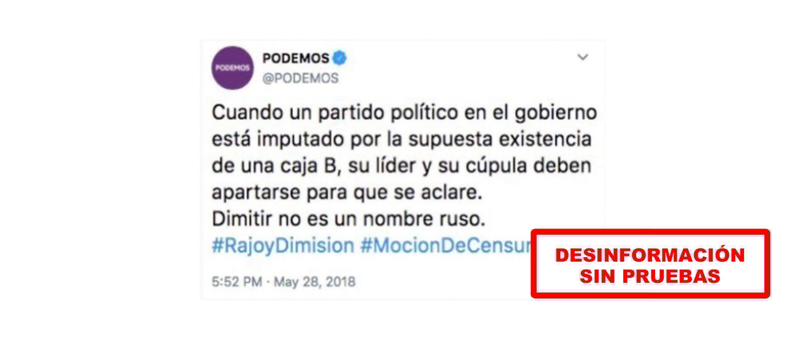 En definitiva, no hay pruebas de que Podemos haya tuiteado que "cuando un partido político en el gobierno está imputado por la supuesta existencia de una caja B, su líder y su cúpula deben apartarse para que se aclare".