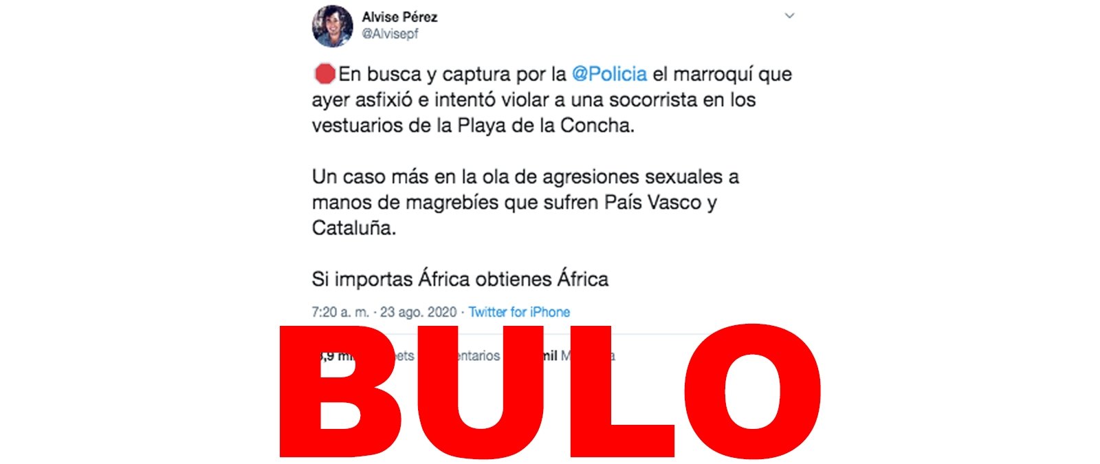 Está circulando un tuit que asegura que está en busca y captura "el marroquí que ayer asfixió e intentó violar a una socorrista en los vestuarios de la Playa de la Concha", en San Sebastián. El tuit fue publicado el 23 de agosto y los hechos que narra supuestamente tuvieron lugar el 22 de agosto de 2020. Sin embargo, es un bulo que los hechos ocurrieran el pasado fin de semana. La Ertzaintza y el Ayuntamiento de San Sebastián afirman que no tienen constancia de que se haya dado un caso como este en los últimos días. En cambio, varios medios sí que se hicieron eco en agosto de 2019 de un suceso igual al descrito en el tuit.