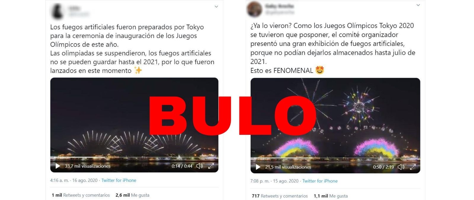 Este vídeo, que circula en España desde al menos el 15 de agosto, se comparte con mensajes como "Los fuegos artificiales fueron preparados por Tokyo para la ceremonia de inauguración de los Juegos Olímpicos de este año. Las olimpiadas se suspendieron, los fuegos artificiales no se pueden guardar hasta el 2021, por lo que fueron lanzados en este momento". También se difunde con otros similares como "¿Ya lo vieron? Como los Juegos Olímpicos Tokyo 2020 se tuvieron que posponer, el comité organizador presentó una gran exhibición de fuegos artificiales, porque no podían dejarlos almacenados hasta julio de 2021. Esto es FENOMENAL".