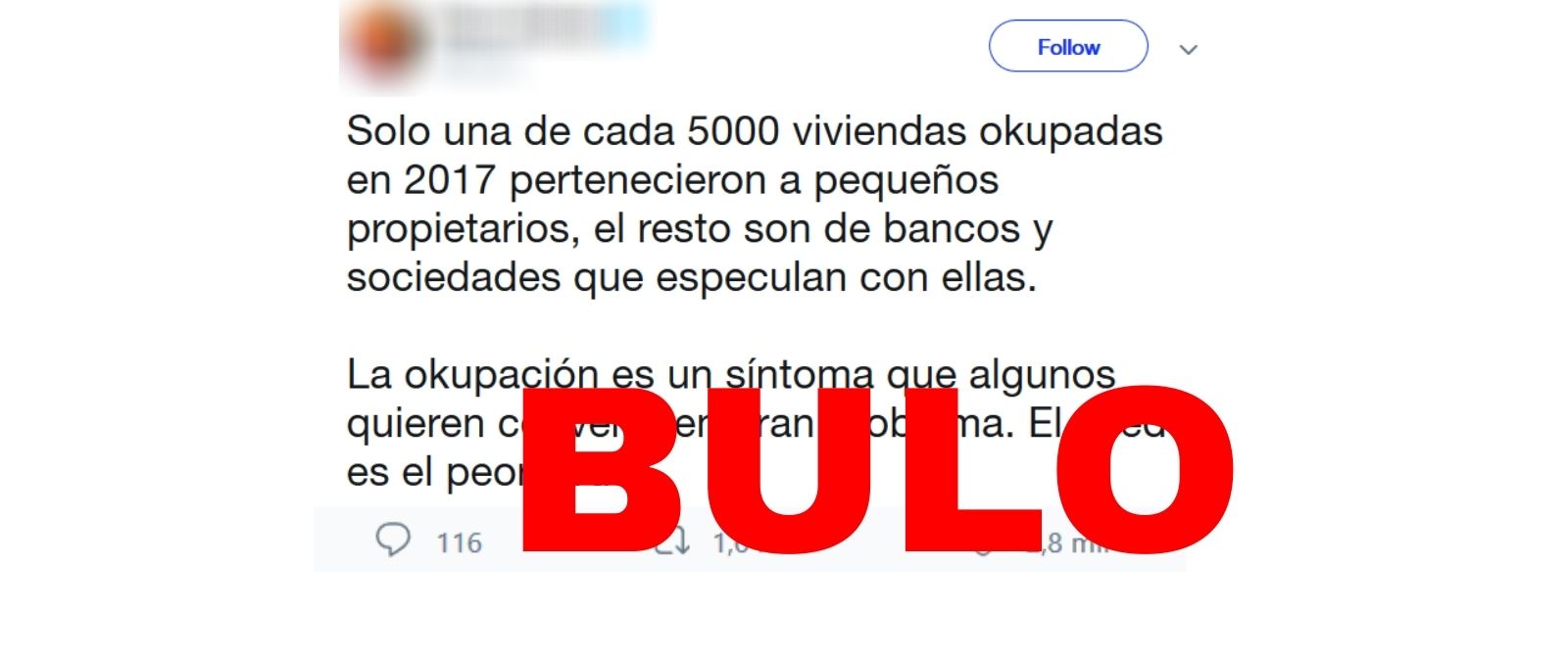 Se ha viralizado un tuit que afirma que "Solo una de cada 5000 viviendas okupadas en 2017 pertenecieron a pequeños propietarios, el resto son de bancos y sociedades que especulan con ellas. La okupación es un síntoma que algunos quieren convertir en gran problema. El miedo es el peor virus". Enlazaba como fuente un artículo de Emmanuel Rodríguez publicado en CTXT titulado '¿Qué hay detrás de la campaña contra la okupación?', pero Rodríguez no dice eso.