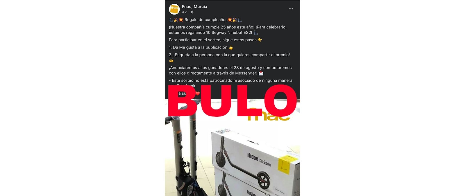 Nos habéis preguntado por un supuesto sorteo de un patinete eléctrico que ha realizado la tienda de Fnac en Murcia en Facebook. Es un timo.