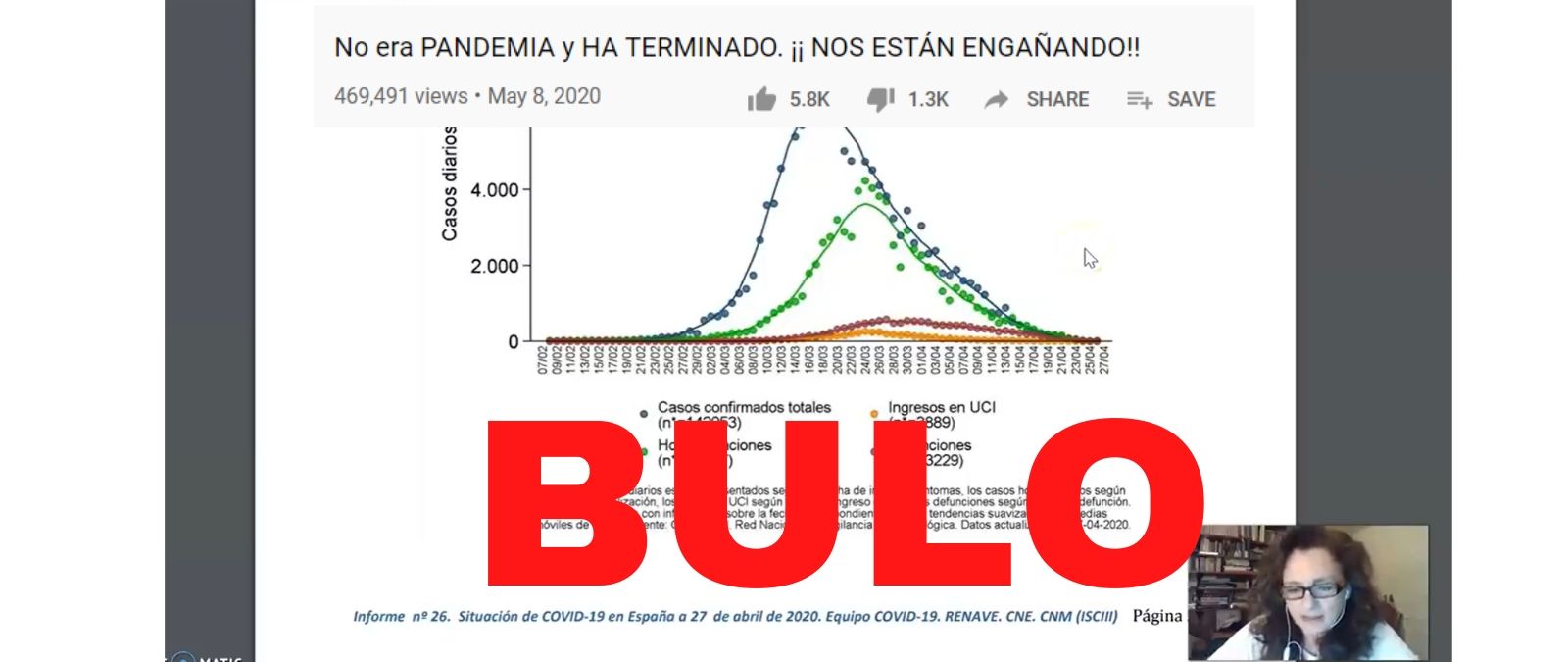Nos habéis vuelto a preguntar por un vídeo (ya retirado de Youtube) que se ya se movió en mayo y en el que una mujer llamada Pilar Baselga asegura que el Instituto de Salud Carlos III de Madrid ha dicho en un informe que la pandemia por coronavirus SARS-CoV-2 ha terminado. Para decir esto se basa en una gráfica de curvas publicada en el informe número 26 de dicho organismo: "La pandemia ha terminado y no lo digo yo, lo dice el Instituto Carlos III con su departamento de Epidemiología, aquí estoy en su página web oficial, y esta es la curva del COVID-19" [a partir del minuto 00:12]. Es un bulo.