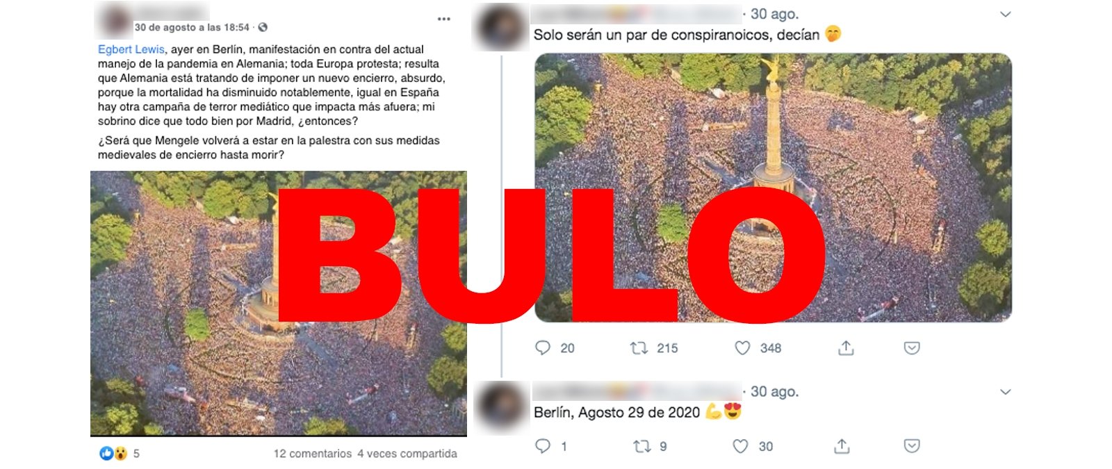 Se está moviendo por redes sociales una fotografía de la plaza de la Columna de la Victoria de Berlín abarrotada de gente como si fuera de las manifestaciones negacionistas del coronavirus celebradas el pasado fin de semana en la capital alemana. Pero es un bulo, la foto circula por internet, al menos, desde 2009 y se la relaciona con el festival 'Love Parade' de Berlín.