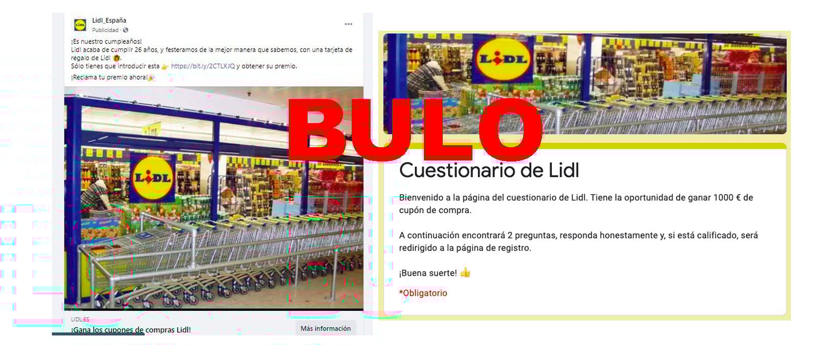 Mucho cuidado si en los próximos días te encuentras con una supuesta promoción de Lidl por la que estarían repartiendo tarjetas de regalo de 1.000€ para celebrar su 26 aniversario, porque, tal y como nos señalan desde Lidl, se trata de un caso de phishing, una técnica que busca hacerse con tus datos y, en ocasiones, con tu dinero. La compañía ha asegurado a Maldita.es que no tienen "nada que ver" con este caso y que ya han "procedido a realizar las gestiones necesarias para el cierre de la página".