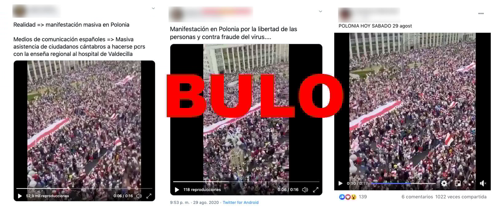 Se está difundiendo un vídeo en redes que supuestamente habría sido grabado el pasado 29 de agosto en Polonia durante una manifestación negacionista del coronavirus. Es un bulo: las imágenes fueron grabadas en Minsk (Bielorrusia) y muestran una protesta contra el Gobierno del país, presidido por Aleksandr Lukashenko. Además, el vídeo ya había sido compartido falsamente como si fuera de la manifestación negacionista de la COVID-19 celebrada en Berlín el 29 de agosto, cosa que desmentimos en Maldita.es.