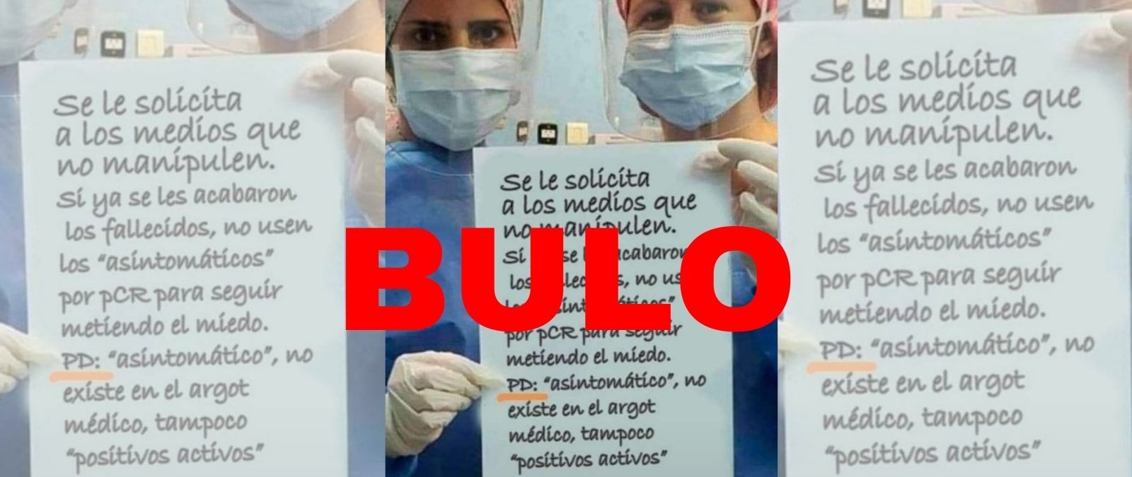 En el cartel que enseñan a la cámara las dos sanitarias se puede leer este mensaje: "Se le solicita a los medios que no manipulen. Si ya se les acabaron los fallecidos, no usen los 'asintomáticos' por PCR para seguir metiendo el miedo. PD: 'asintomático', no existe en el argot médico, tampoco 'positivos activos'". Esta imagen se mueve desde agosto de 2020.