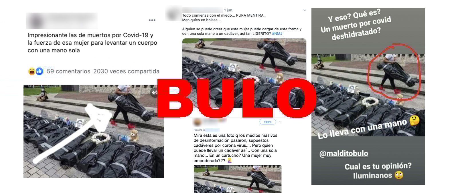 Circula por las redes una imagen que supuestamente muestra decenas de cuerpos de víctimas de la COVID-19 apilados y a una mujer llevando uno de ellos con una sola mano. Debido a esto último, las publicaciones insinúan que los cadáveres son falsos pese a que estarían siendo mostrados como reales por los medios de comunicación. Es un bulo: son cuerpos ficticios utilizados por unos activistas en Miami para rendir homenaje a las víctimas de la COVID-19 y protestar contra la gestión de las autoridades.