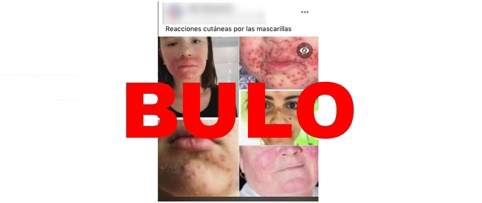 Nos habéis preguntado por un collage de cinco imágenes que supuestamente muestran unas "reacciones cutáneas a las mascarillas", pero la realidad es que cuatro de esas fotos han sido descontextualizadas o manipuladas: tres de ellas salen de bancos de imágenes y páginas webs a las que fueron subidas años antes de la pandemia de la COVID-19, mientras que otra sí se debe al uso de ropa de protección pero ha sido manipulada para resaltar las marcas de la cara. El collage también incluye la foto de una niña que, según su madre, habría tenido una reacción alérgica tras usar la mascarilla, pero los expertos explican que habría que realizarle una prueba para confirmarlo y que podría ser otra patología.