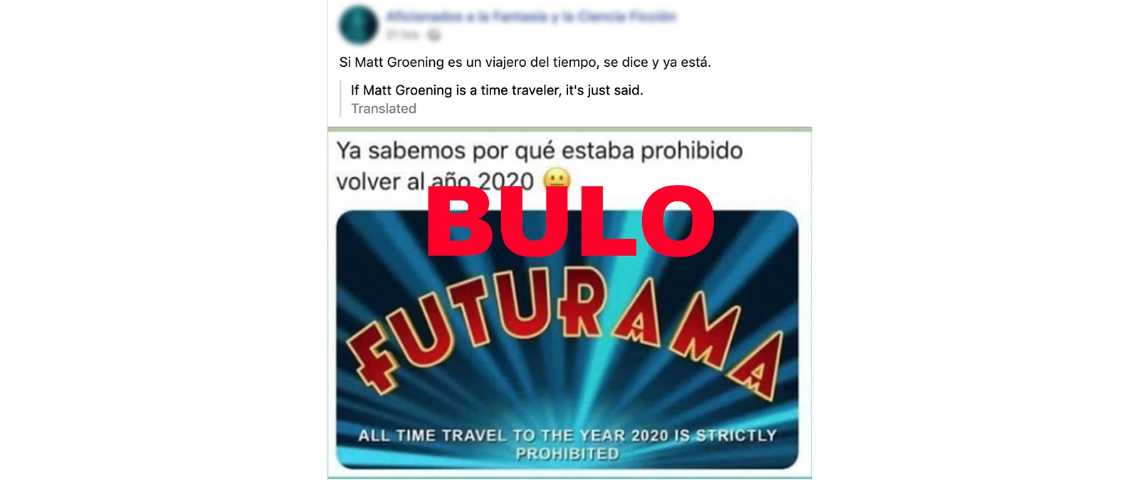 Volvéis a preguntarnos por una captura que circula en redes sociales de una de las cabeceras de la serie Futurama en la que aparece un mensaje que dice en inglés "todo viaje al año 2020 está estrictamente prohibido" atribuyendo a Matt Groening, el creador de la serie, haber predicho lo sucedido en este 2020 con la pandemia de coronavirus. Pero esa imagen no es real.