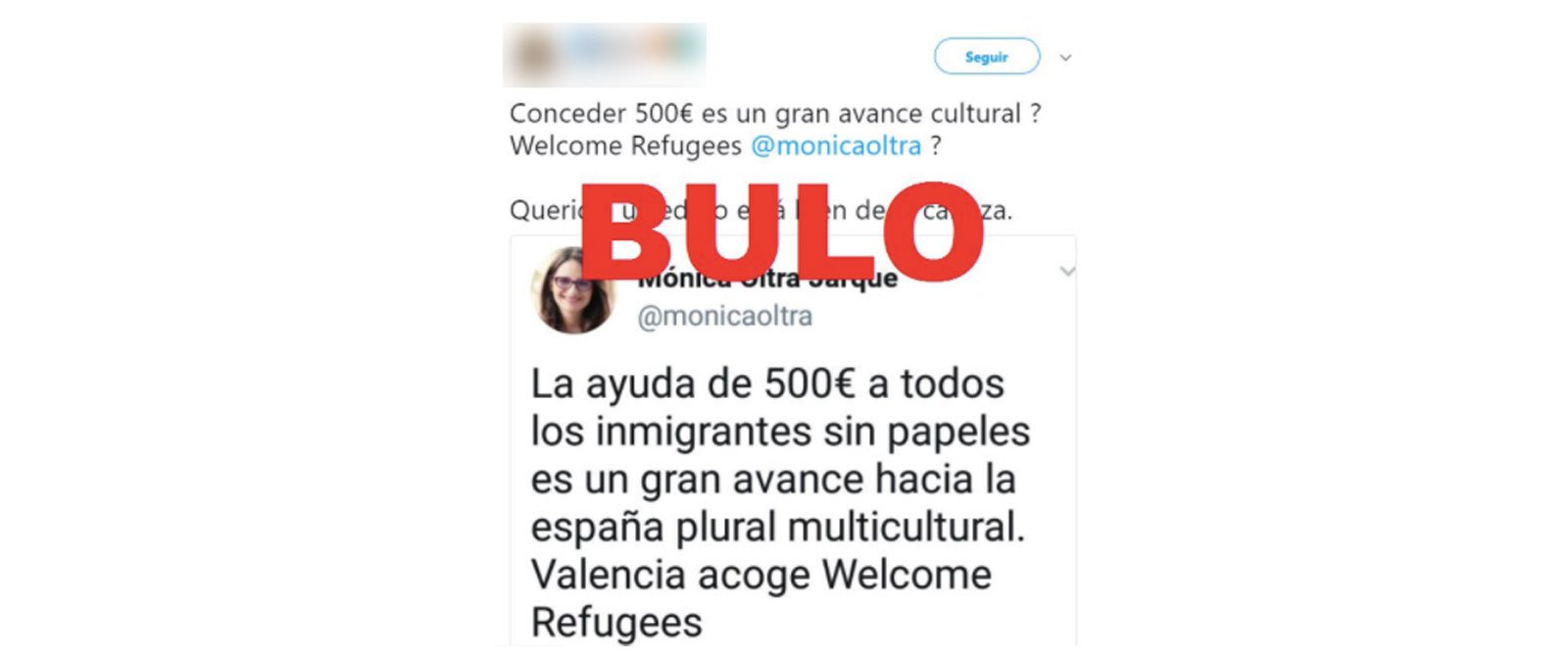 Por lo tanto, la vicepresidenta de la Generalitat Valenciana, Mónica Oltra, no ha tuiteado que "la ayuda de 500€ a todos los inmigrantes sin papeles es un gran avance hacia la España plural multicultural". Es un bulo.