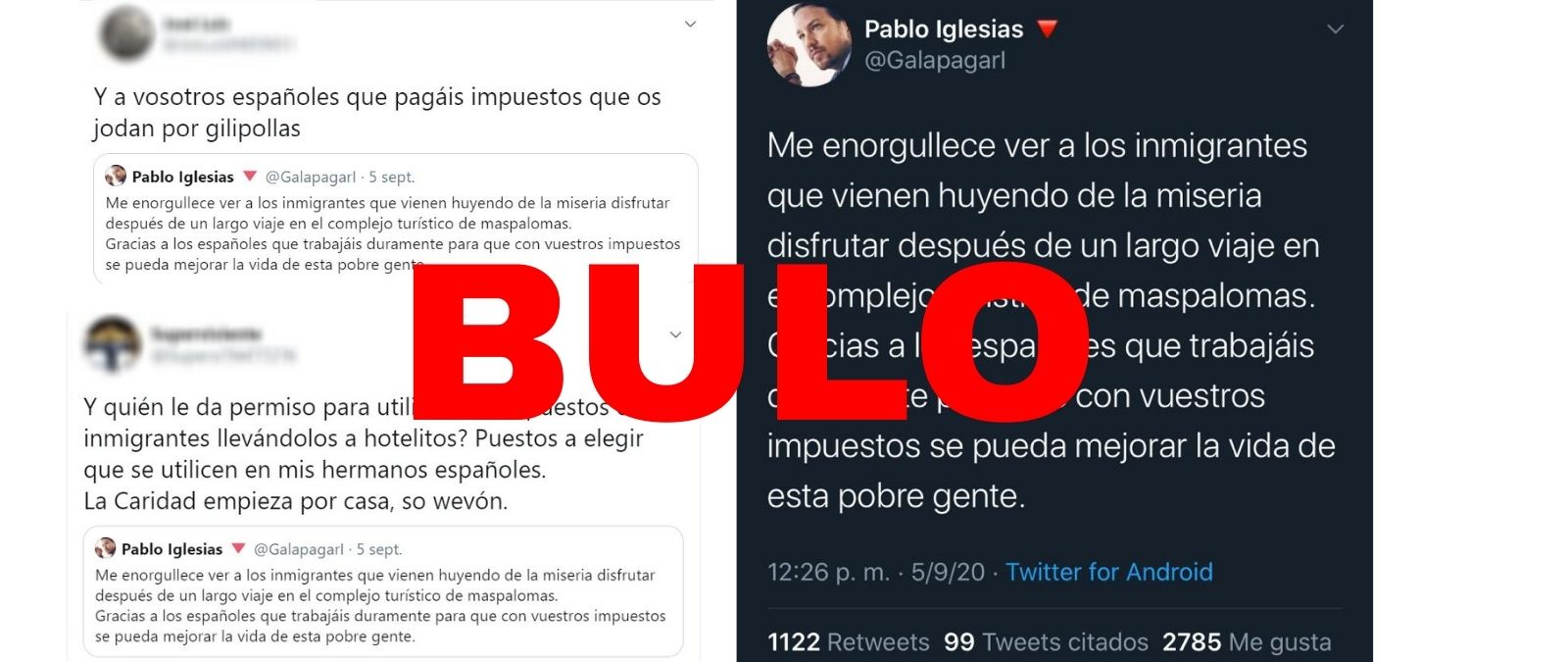 Coincidiendo con la viralización de un vídeo de varias personas nadando en una piscina que se mueve falsamente como si fueran inmigrantes alojados en un hotel de Maspalomas (Gran Canaria), se está difundiendo un tuit que habría publicado supuestamente el vicepresidente segundo del Gobierno, Pablo Iglesias, en el que se puede leer lo siguiente: "Me enorgullece ver a los inmigrantes que vienen huyendo de la miseria disfrutar después de un largo viaje en el complejo turístico de Maspalomas. Gracias a los españoles que trabajáis duramente para que con vuestros impuestos se pueda mejorar la vida de esta pobre gente". Es un bulo. El tuit se ha publicado desde una cuenta "parodia".
