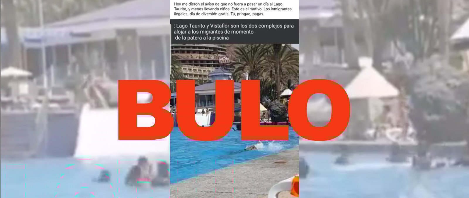 Es un bulo: no hay inmigrantes alojados en el hotel Paradise Lago Taurito, según afirma Delegación del Gobierno en Gran Canaria a Maldita.es, y el vídeo está grabado en el parque acuático Lago Taurito que está al lado del hotel. Según señalan desde Delegación del Gobierno, los inmigrantes que han sido alojados en hoteles en Gran Canaria no tienen permitido el uso de zonas comunes como piscinas.