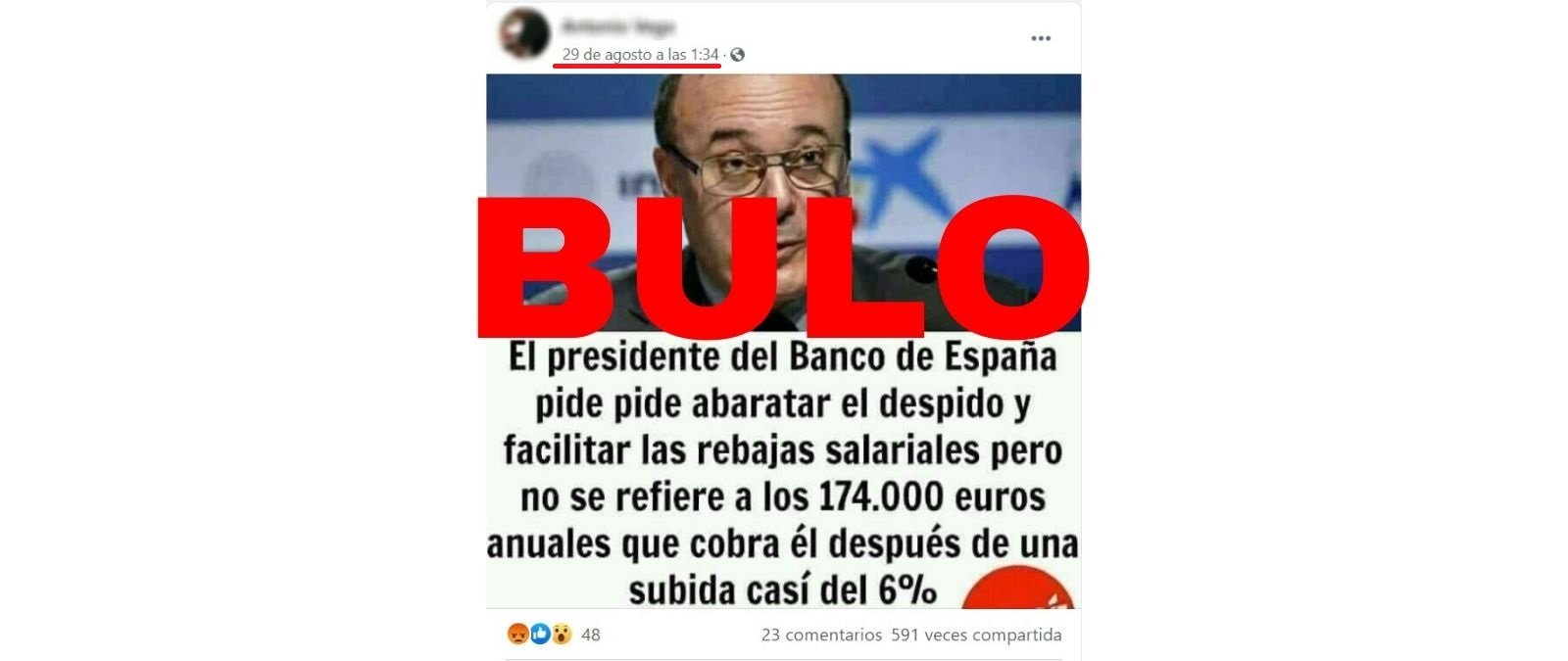 La frase completa dice que "el presidente del Banco de España pide abaratar el despido y facilitar las rebajas salariales pero no se refiere a los 174.000 euros anuales que cobra él después de una subida del 6%". Sin embargo, está sacada de unas declaraciones de 2016. En ese momento Luis María Linde era el gobernador del Banco de España. Un cargo que ocupó hasta el año 2018, cuando le sucedió Pablo Hernández de Cos.