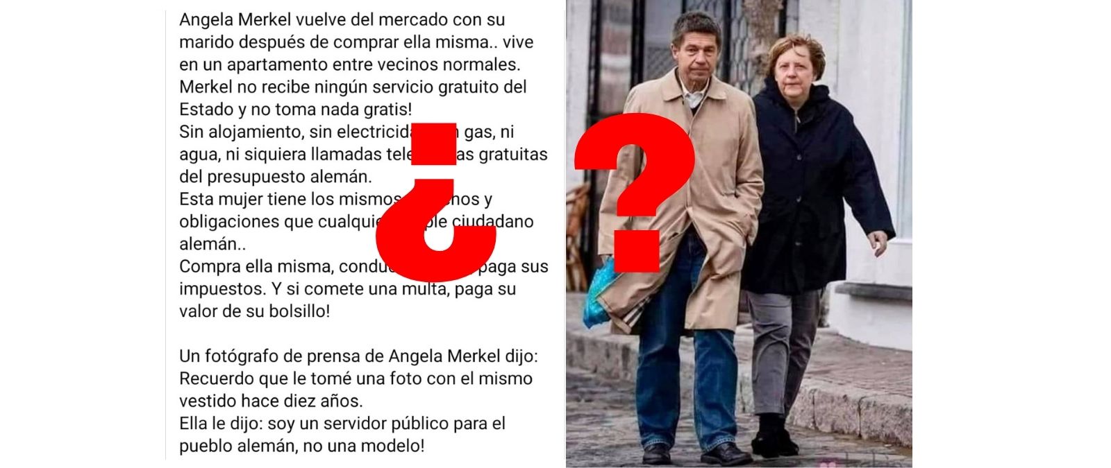 Nos habéis preguntado a través de nuestro chatbot (+34 644 22 93 19) por una foto de la canciller alemana, Angela Merkel, que camina junto a su pareja, Joachim Sauer. La foto circula con un texto que comienza afirmando que Merkel "vuelve del mercado con su marido después de comprar ella misma" y que "vive en un apartamento entre vecinos normales". La foto fue tomada durante unas vacaciones en Italia y según los medios, Merkel vive en un edificio de apartamentos y no en la Cancillería. Os lo contamos.