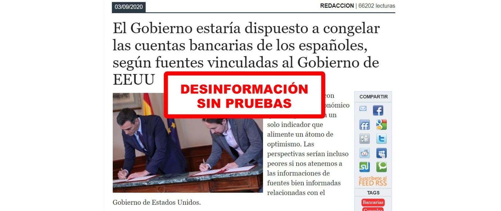 Este contenido fue publicado por la web Alerta Digital y dice que "se teme que ante la situación que va a provocar en España la falta de recaudación en Hacienda, así como los problemas de financiación en la Unión Europea, el Gobierno español estaría dispuesto a congelar las cuentas de los españoles", a los que sólo se les permitiría sacar una cantidad determinada de dinero al día que todavía no se habría determinado. Según este texto, la supuesta información habría salido de "fuentes bien informadas relacionadas con el Gobierno de Estados Unidos".