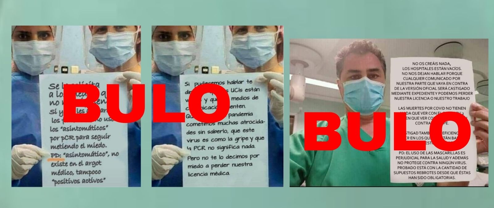 También nos habéis preguntado por esta imagen en la que las dos sanitarias sostienen un cartel en el que pone que las Unidades de Cuidados Intensivos (UCI) están vacías, que el coronavirus es como la gripe y que las pruebas PCR no significan nada. Es un bulo. La foto es un montaje en el que se ha manipulado el texto del cartel para desinformar. Además, la COVID-19 no es como la gripe y las PCR sí funcionan. Os lo contamos con más detalle aquí.