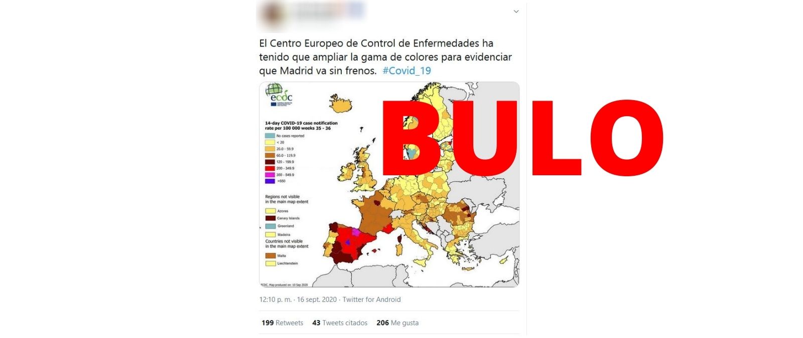 Se ha viralizado un mapa que cita como fuente el Centro Europeo de Control de Enfermedades (ECDC por sus siglas en inglés) en el que se observa la Comunidad de Madrid como la región europea con más casos, siendo el único que sale en color azul con más de 550 casos de CODIV-19 por 100.000 personas reportados en 14 días. El mapa se acompaña con un mensaje que dice que el ECDC "ha tenido que ampliar la gama de colores para evidenciar que Madrid va sin frenos". Es un bulo: el mapa del ECDC tiene como máxima categoría, en color marrón, más de 120 casos por 100.000 personas y Madrid aparece en marrón, al igual que otras regiones de España y de otros países europeos. Aunque el mapa no provenga de la web del ECDC ni el ECDC ha ampliado la gama de colores, es cierto que la Comunidad de Madrid es la región europea con más casos notificados de COVID-19 por 100.000 habitantes en las semanas 35 y 36 de 2020 con una tasa de 543 casos por 100.000 habitantes en 14 días, según los datos del ECDC analizados por Maldita.es.