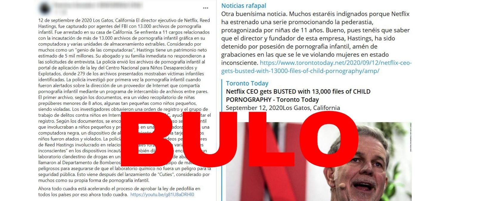 Están circulando contenidos en Facebook, Twitter y webs que aseguran que el director ejecutivo de la plataforma Netflix, Reed Hastings, fue arrestado el 12 de septiembre por el FBI. Según estos contenidos, los agentes habrían encontrado 13.000 archivos de pornografía infantil en su ordenador, de los cuales 279 "mostraban víctimas infantiles identificadas". Además, añaden que también se le han encontrado vídeos violando a mujeres en estado inconsciente. Es un bulo. Algunos de los contenidos hacen referencia a una web que ya lo ha borrado y no hay ninguna otra referencia a esa supuesta detención. Además, el contenido es idéntico a otro de 2019 y el FBI no ha publicado nada al respecto, como sí hace con otros casos.